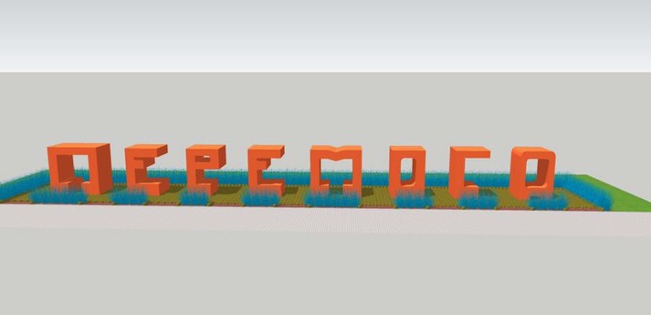 Виготовлені такі літери з дерева та встановлені на ділянці, вимощеній дерев’яними надовбнями. Навколо арт-об’єкту висаджено декоративні кущі та злакові рослини.