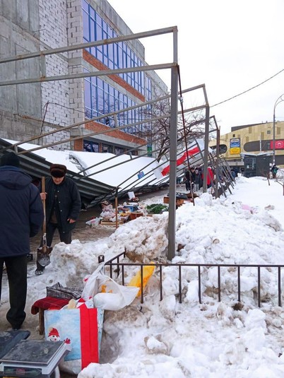 На фото з місця подій можна бачити, що квола металева конструкція неподалік від станції метро «Героїв Дніпра» впала прямо на тротуар з торговим рядом. Ймовірно, вона не витримала ваги снігу.