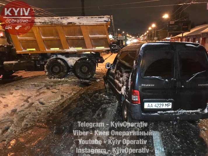 «Близько 20:45 на вулиці Луговій, біля мийки «АвтоБаня» водій сніговбирального авто МАЗ, д.н.з. AA4606IB, вирішив, що комунальний транспорт може спокійнесенько розвернутися через подвійну суцільну лінію. До цього маневру не був готовий водій Peugeot, д.н.з. AA4229MP, який їхав позаду вантажівки у попутному напрямку», - йдеться в повідомленні.