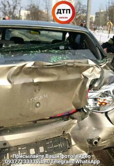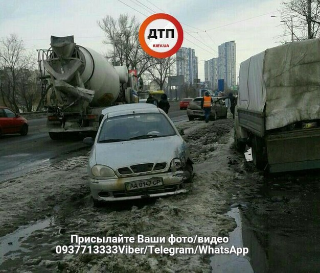 «Їхали з чоловіком по пр. Соборності (Злуки), на зустрічній смузі аварія, відразу за зупинкою громадського транспорту «Русанівка». Водій Lanos, перебуваючи в неадекватному стані, виїхав на реверсну смугу, потім різко повернув вправо ... підрізав водія таксі (теж на Lanos). А за таксі в'їхав водій на Renault (на фото з розбитим вікном) ... ну і закінчив ланцюжок водій бетоновоза. Дивом усі залишилися живі. У водія Lanos прав немає», - повідомили очевидці аварії.