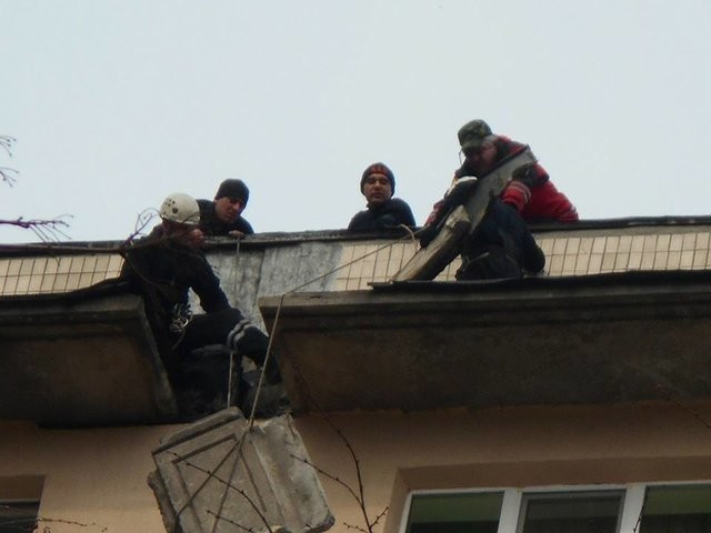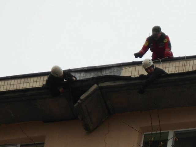 «Надійшло повідомлення, що на даху будинку знаходиться бетонна плита, яка може впасти в будь-яку хвилину і травмувати перехожих. За допомогою спеціальних тросів і висотного спорядження рятувальники закріпили аварійну плиту і акуратно зняли її», - повідомили рятувальники.