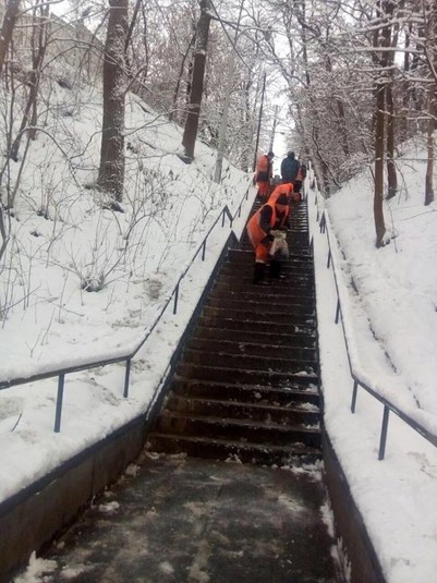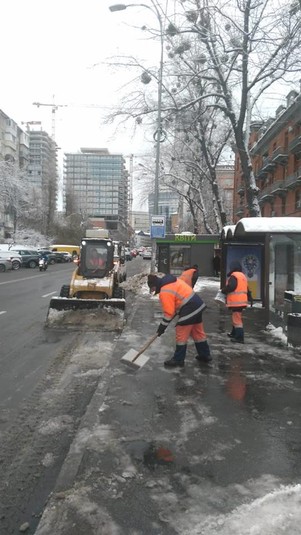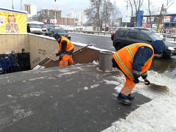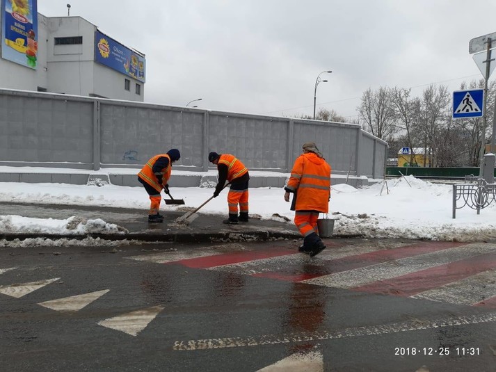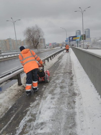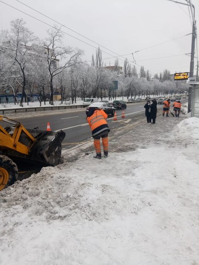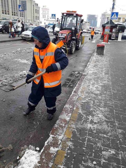 Малогабаритна спецтехніка та бригади з ручного прибирання проводили роботи з зимового утримання тротуарів, зупинок і пішохідних зон, що утримуються підприємствами корпорації.