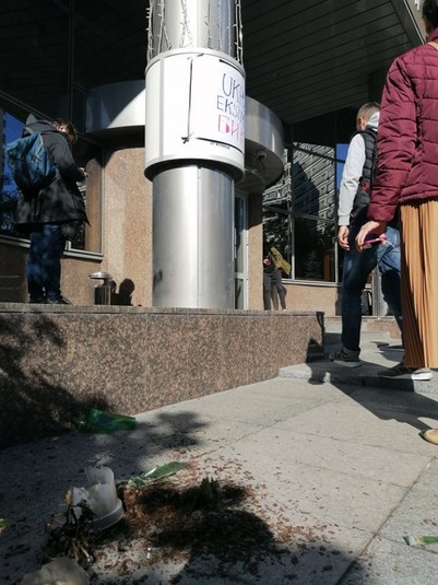 «Коли журналісти підійшли до будівлі з вікна банку на них впав вазон. Чи його хтось скинув, чи він випав сам – невідомо», – пише ЗМІ.