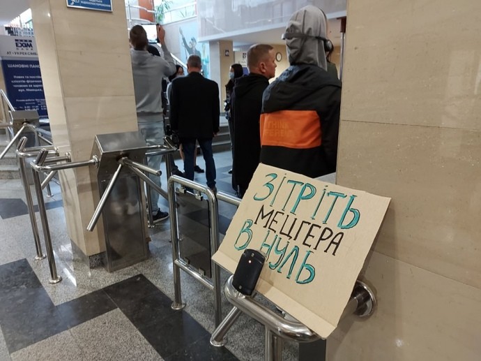 Мітингарі зібралися біля банку з плакатами UkrekximБик та Мецгер Out. Вони вимагають відставки керівництва та розслідування нападу на журналістів проєкту «Схеми».