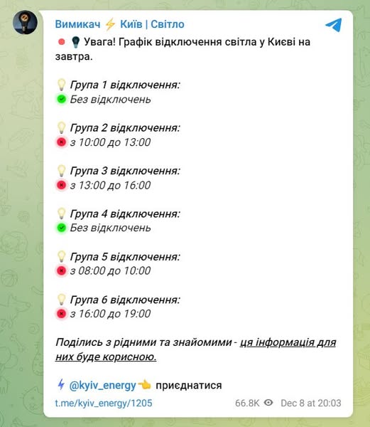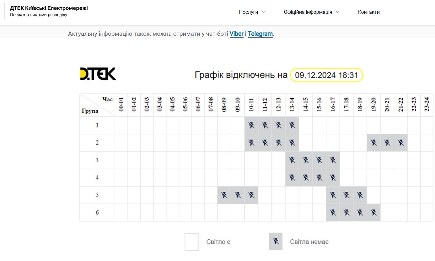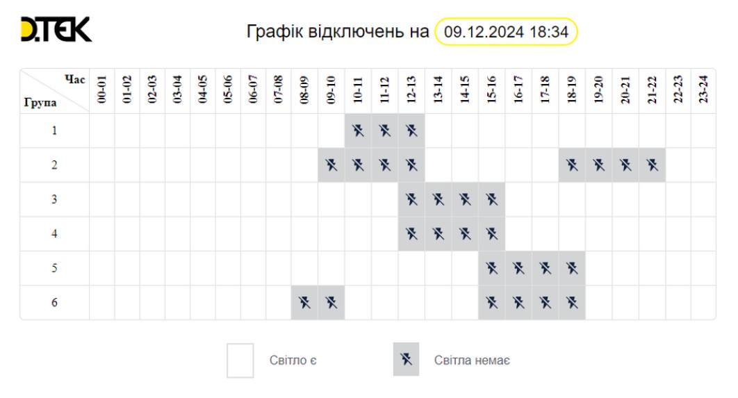 Нагадаємо, завтра, 10 грудня, відключення світла діятимуть як для побутових споживачів, так і для бізнесу.