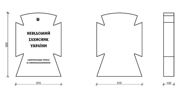 На лицьовому боці намогильної споруди невпізнаних військовослужбовців, поліцейських, які загинули (померли) внаслідок збройної агресії проти України, наноситься зображення тризуба, написи «Невідомий захисник України» та «Ідентифікація триває», а також унікальний код (номер) тіла (останків), що присвоюється відповідно до наказу МОЗ від 8 березня 2022 р. № 428 «Про затвердження Порядку оснащення спеціальних груп під час збору тіл матеріалами та обладнанням».