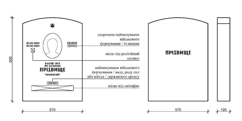 На лицьовому боці намогильної споруди наноситься зображення тризуба, монохромний портрет загиблої (померлої) особи (за наявності), напис державною мовою власного імені, по батькові (за наявності), прізвища, дати народження і смерті, військового або спеціального звання (за наявності).