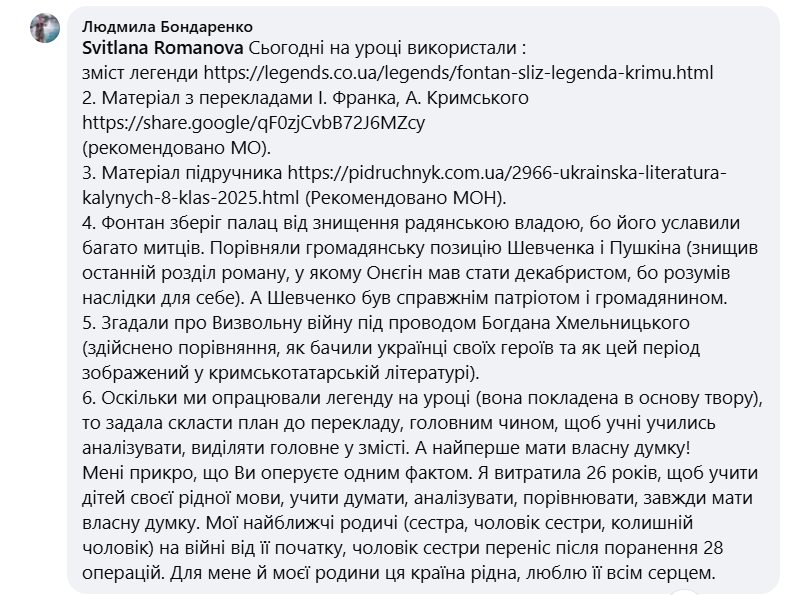 Вчителька ліцею Людмила Бондаренко у коментарях під дописом свого учня написала, що під час уроку було використано матеріали підручника та творчість І. Франка та А. Кримського, рекомендовані Міністерством освіти. Бондаренка зауважила, що фонтан зберіг палац від знищення радянською владою, бо його уславили багато митців. За словами вчительки, під час уроку вона з учнями порівнювала громадянську позицію Шевченка і Пушкіна, який знищив останній розділ роману, у якому Онєгін мав стати декабристом, бо розумів наслідки для себе, а Шевченко був справжнім патріотом і громадянином. Також, за словами педагогині, під час уроку згадували про Визвольну війну під проводом Богдана Хмельницького, це було здійснено для порівняння, як бачили українці своїх героїв та як цей період зображений у кримськотатарській літературі.