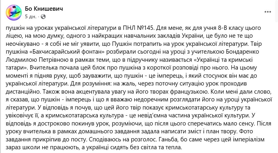 «Пушкін на уроках української літератури в природничо-науковому ліцеї №145. Для мене як для учня 8-В класу цього ліцею, на мою думку, одного з найкращих навчальних закладів України, це було не те що неочікувано – я собі не міг уявити, що Пушкін потрапить на урок української літератури», – написав хлопець.