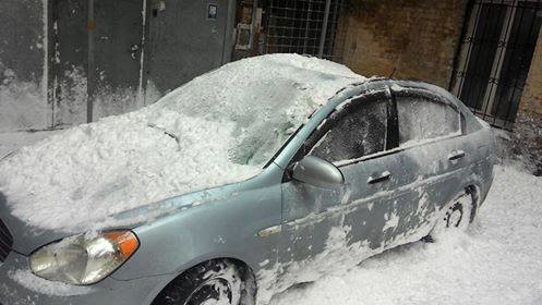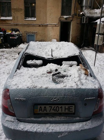 В одному зі столичних дворів величезна грудка снігу, яка впала з даху житлового будинку розтрощила припаркований автомобіль.