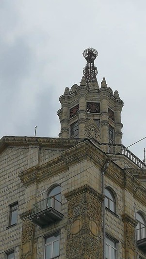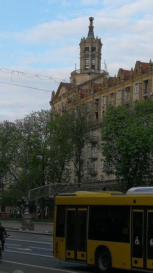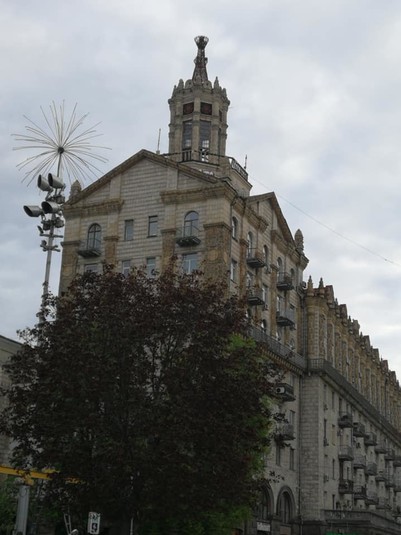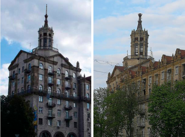 Будівля по вулиці Хрещатик, 13, була побудована у 1948 році і виділялася в архітектурному ансамблі вулиці завдяки шпилю і фігурним обеліскам на верхньому ярусі. У будинку з 50-х років жили художники, актори, музиканти, диригенти, діячі науки.
