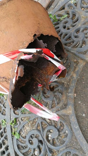 Декоративна конструкція на вершині будинку проржавіла і впала на тротуар.