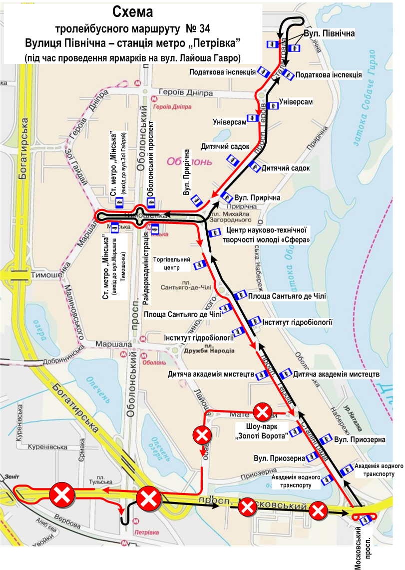 - на вул. Йорданській (вул. Лайоша Гавро) на ділянці від вул. Олександра Архипенка до просп. Московського рух тролейбусів маршруту № 34 організовується за таким напрямком руху: вул. Північна – просп. Героїв Сталінграда – вул. Маршала Тимошенка – просп. Героїв Сталінграда – просп. Московський та в зворотному напрямку;