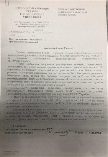 Він також опублікував документ: лист начальника Головного слідчого управління Національної поліції України Максима Цуцкірідзе з проханням направити «справу Ємельянова» в поліцію Київської області.
