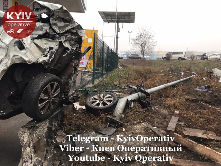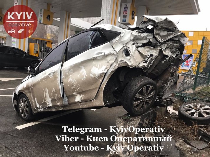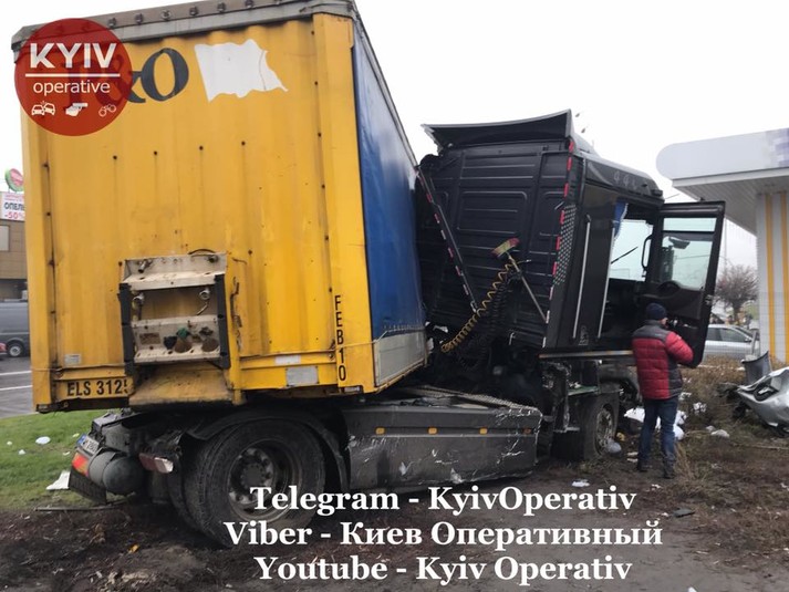 На перехресті вантажівка в'їхала у Mitsubishi, а потім почала зносити все на своєму шляху - сміттєві баки, стовп, паркан. Далі фура в'їхала на стоянку АЗС КЛО, де водій Hyundai як раз зупинився, щоб піти за кавою.