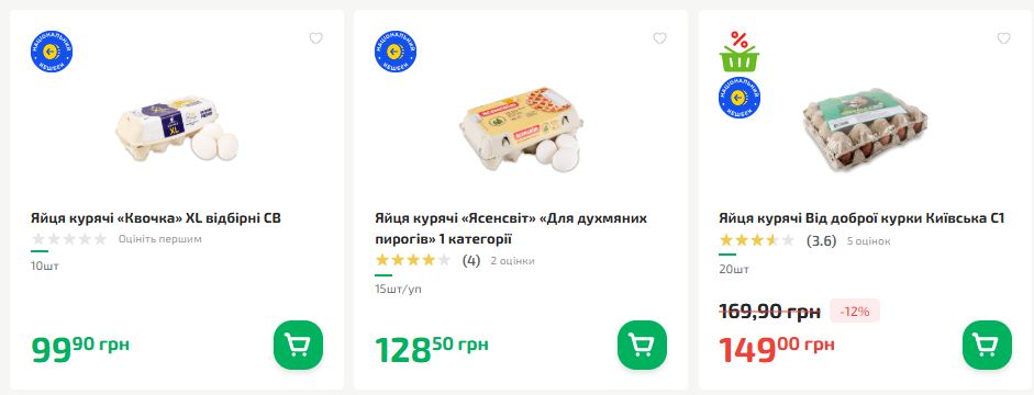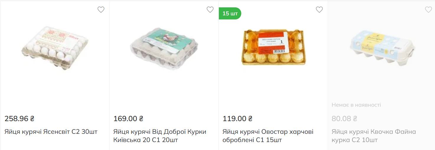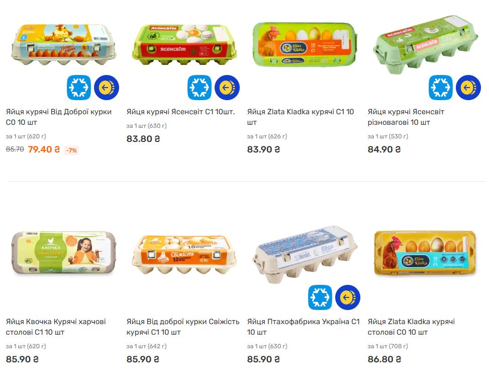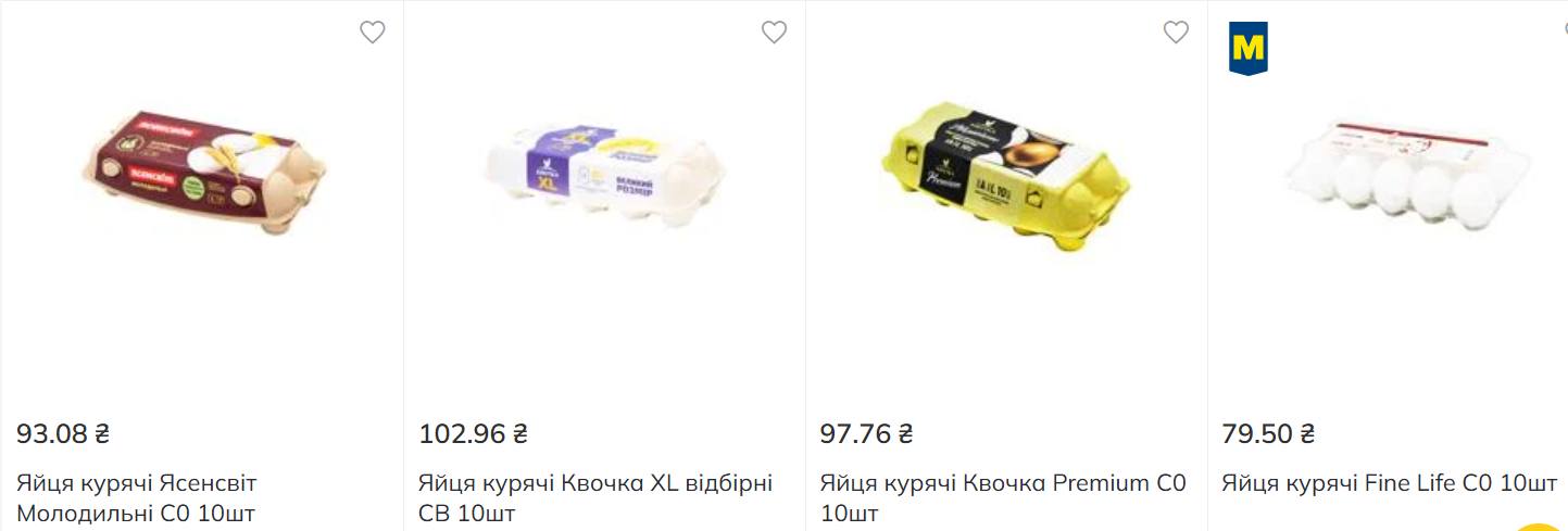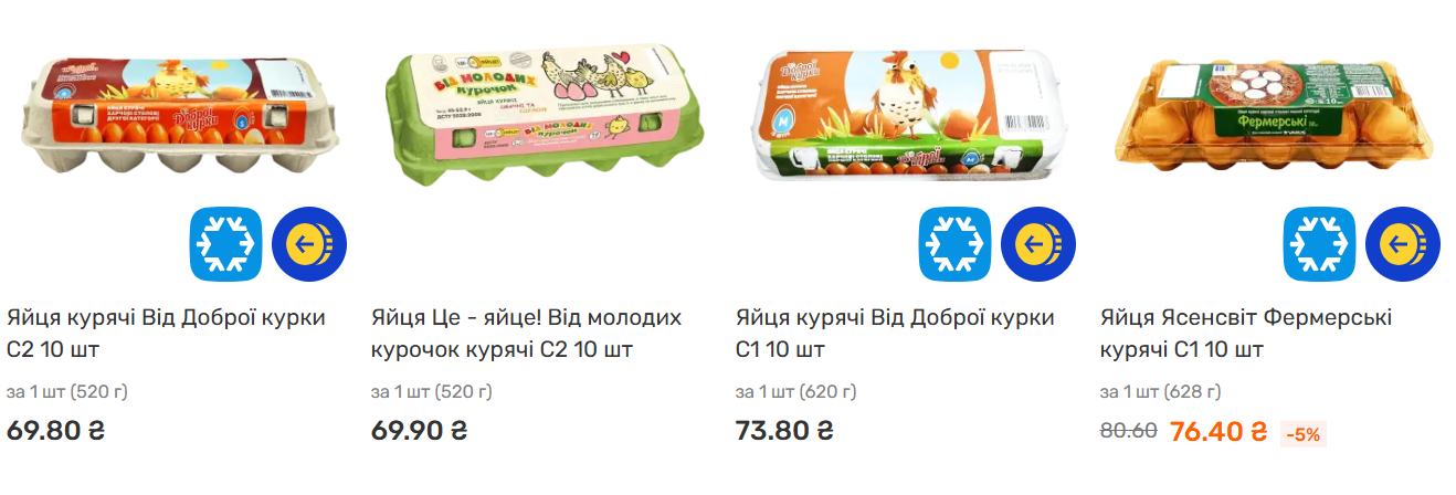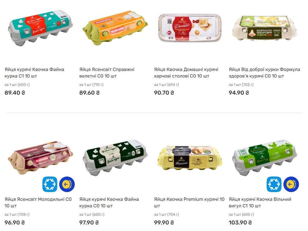 Більш бюджетні варіанти представлені власною маркою мережі «Своя лінія» за 76,50 грн. Найдешевшим же залишається нефасоване яйце першої категорії – його ціна становить 65,80 грн за десяток.