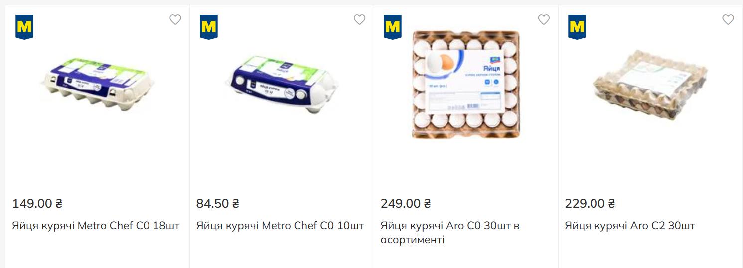 Яйця Aro (категорія С2, 30 шт.) коштують 229,00 грн за упаковку, або 76,30 грн за десяток. Яйця Metro Chef (категорія C0, 18 шт.)коштують 149,00 грн за упаковку, або 84,50 грн за упаковку 10 шт.
