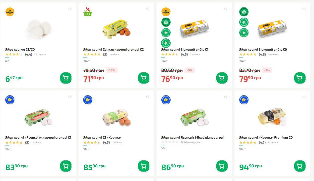 - Яйця «Ясенсвіт» категорія С1 – 83,90 грн за 10 шт., різновагові – 84,90 грн за 10 шт.