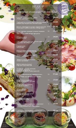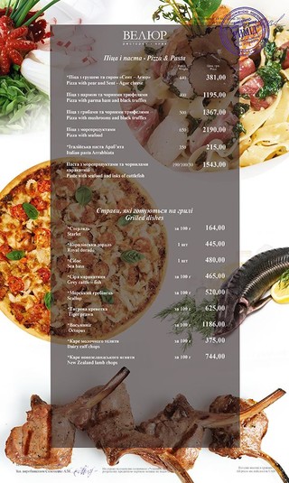 Проте, деякі позиції цього меню теж вражають. Наприклад, піца з морепродуктами (650 г) коштує 2190 грн, а лимонад власного виробництва (1 л) – від 248 грн.