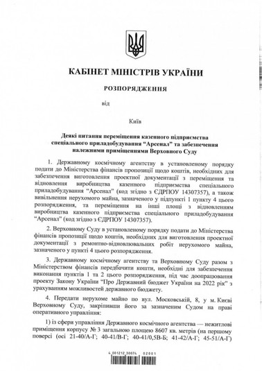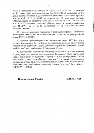 «Корпус №3 по вулиці Московській, 8 у Києві передається Верховному Суду. Раніше там були приміщення казенного підприємства спеціального приладобудування «Арсенал». Натомість будівлю корпусу №5, де зараз розташовується Верховний Суд передадуть до сфери управління Державної судової адміністрації», – прокоментував Гончаренко.