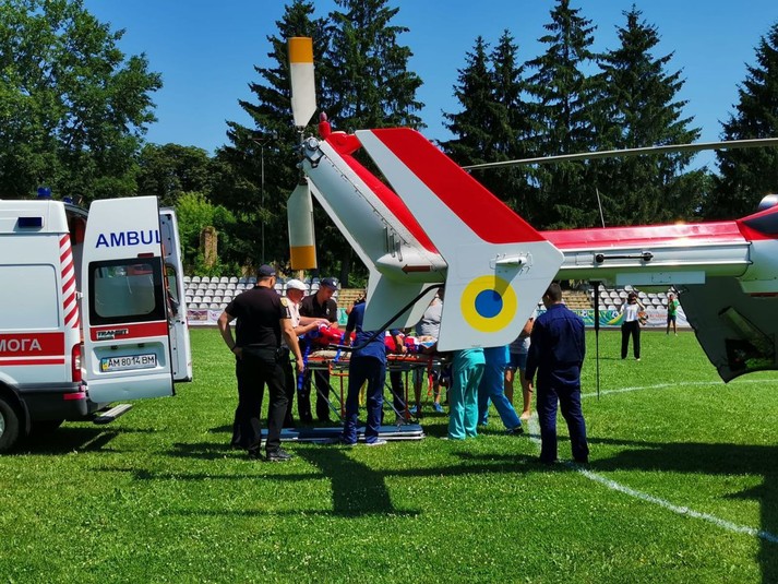 Як розповів голова ДСНС Микола Чечоткін на своїй сторінці у Facebook, вертоліт рятувальників із важкопораненим хлопчиком приземлився на стадіоні «Старт» у Києві.