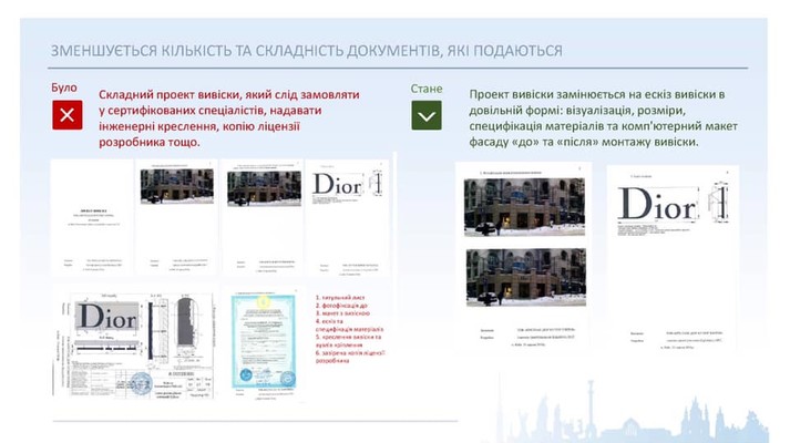 «Раніше підприємцям потрібен був проект вивіски. Його замовляли у сертифікованих спеціалістів, надавали інженерні креслення, копію ліцензії розробника тощо. Зі змінами проект вивіски замінюється на ескіз вивіски, який подаватиметься в довільній формі: візуалізація, розміри, специфікація матеріалів та комп’ютерний макет фасаду «до-після» монтажу вивіски», - сказав Смирнов.