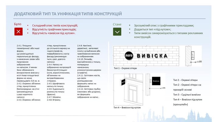 «Приємна новина для підприємців - додаємо новий тип - під кутом (кронштейн)! Якщо раніше для такої конструкції потрібно було оформлювати «Дозвіл», відтепер єдине, що від нього треба, - відповідати Порядку розміщення вивісок. Тобто від погоджувальної процедури переходимо до «заявницької». Також змінюємо складний опис типів конструкцій на зрозумілий з графічними прикладами», - повідомив Смирнов.