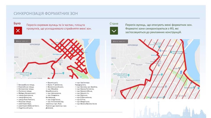 «До сьогодні це був перелік окремих вулиць та їх частин, площ та провулків, що дуже ускладнює візуальне сприйняття. Зараз це спрощений перелік вулиць, які описують межі форматних зон», - розповів Смирнов.