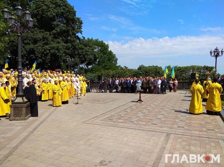 Колона з віруючими попрямувала від Володимирського собору по бульвару Тараса Шевченка до парку Володимирська гірка, де сьогодні вранці пройшли державні урочистості. Хресний хід почався під пісню «Кача».