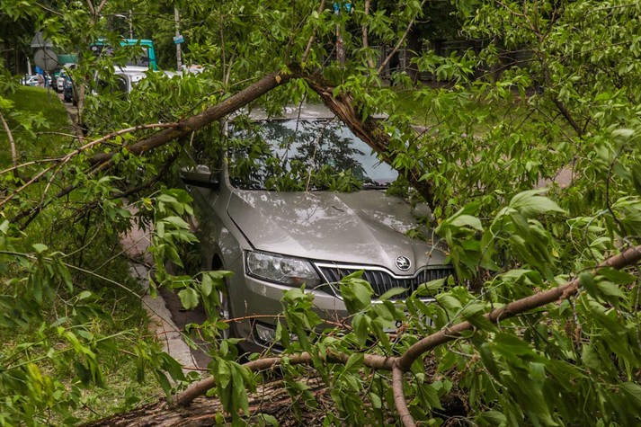 Дерево, що впало, сильно пошкодило передню частину припаркованого автомобіля Skoda Rapid. У машини пом'ятий капот і передній бампер. Людських жертв немає.