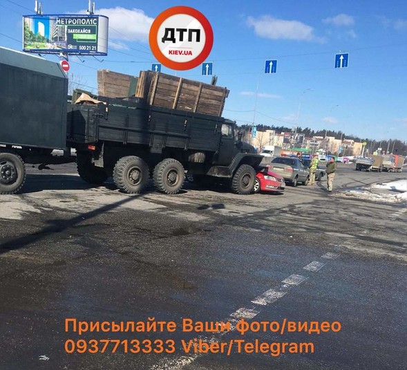 Сьогодні, 22 березня, на вулиці Берковецькій у Києві на перехресті військова вантажівка зіткнулася з автомобілем Volkswagen. Про це повідомляє dtp.kiev.ua у Facebook.