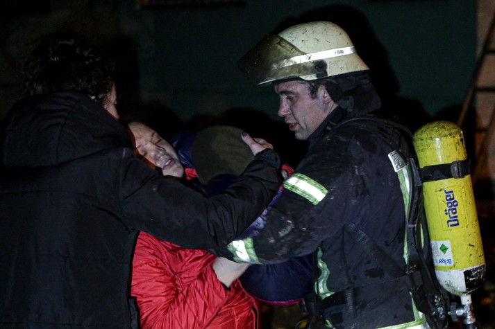 Евакуйованих та врятованих разом з дітьми посадили до пожежних автомобілів, аби люди могли зігрітися.