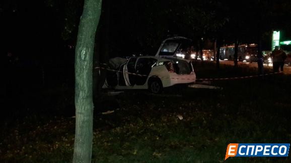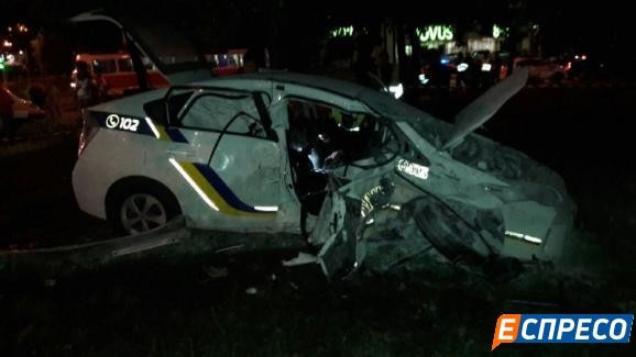 Від удару в бік поліцейське авто відкинуло на тротуар, а потім далі на зелену зону, при цьому побитий «Пріус» чітко пройшов між стовпом і деревом.