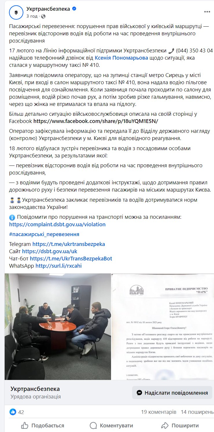 У компанії зазначили, що 17 лютого отримали на лінію інформаційної підтримки «Укртрансбезпеки» дзвінок від Ксенії Пономарьової щодо ситуації, яка сталася у маршрутному таксі № 410.