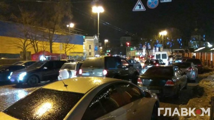 Сьогодні ввечері у центрі Києва біля Софійської площі, де походить святкування Різдва, стався прикрий інцидент. Водій автомобіля «Мазда» паралізував рух на вулиці Володимирській, невдало припаркував свою машину та пішов у справах.