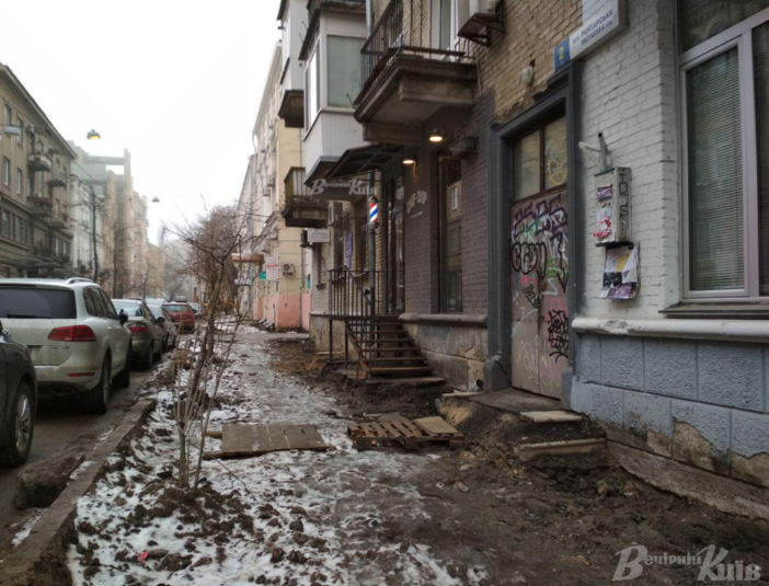 Вулиця Рейтерська у центрі Києва перетворилась на «зону бойових дій». Місяцями пішохідна зона залишається без асфальту та завалена сміттям.
