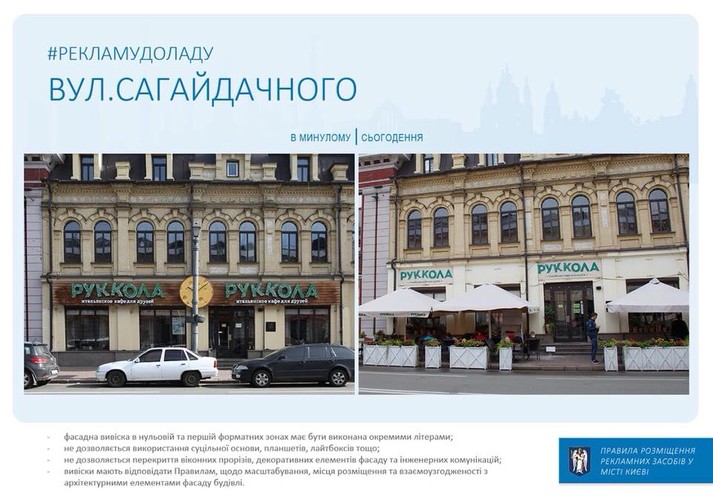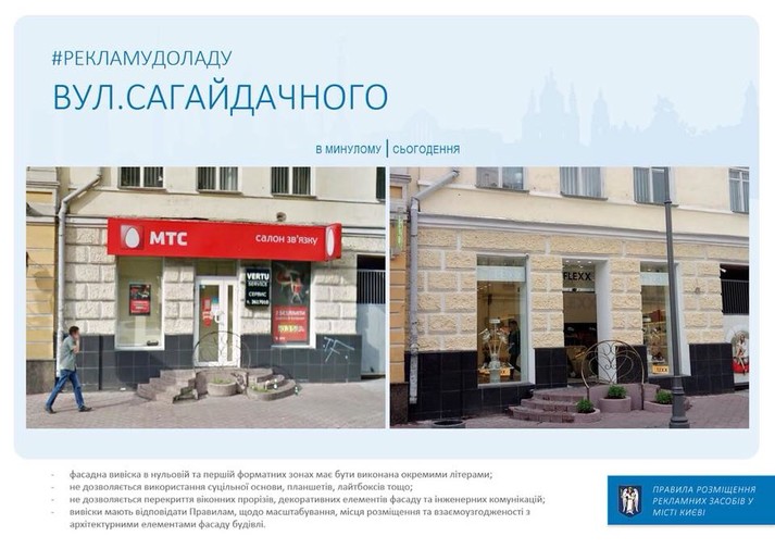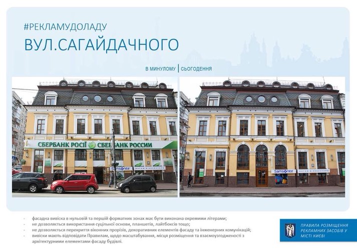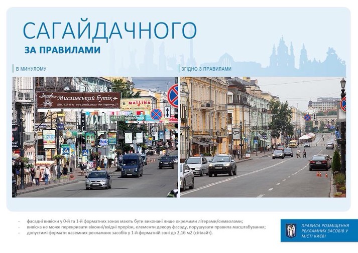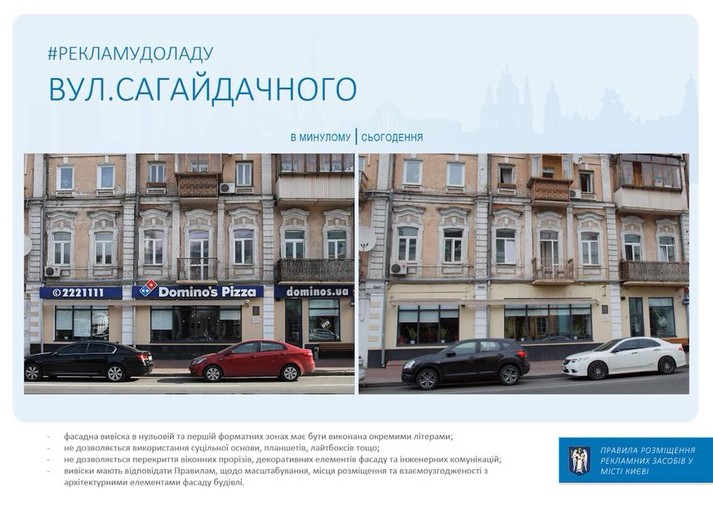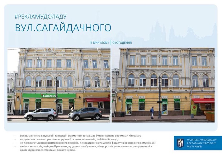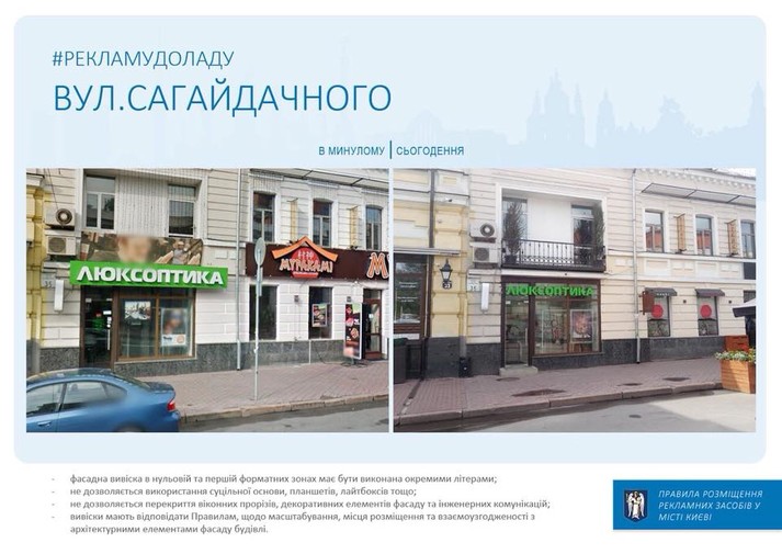 «Відтепер і вулиця Сагайдачного «чиста». Віднедавна Контрактова площа стала пішохідною, та все більше киян і гостей столиці проводять своє дозвілля саме тут. Одна з ключових родзинок вулиці - фасади історичних будівель, які ще ось-ось були захаращені вивісками. Але наразі ми з вами можемо насолоджуватись перспективою вулиці, гарними будівлями... Так, ми це зробили! 183 рекламних засоби залишили Сагайдачного», - написав він.