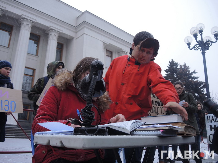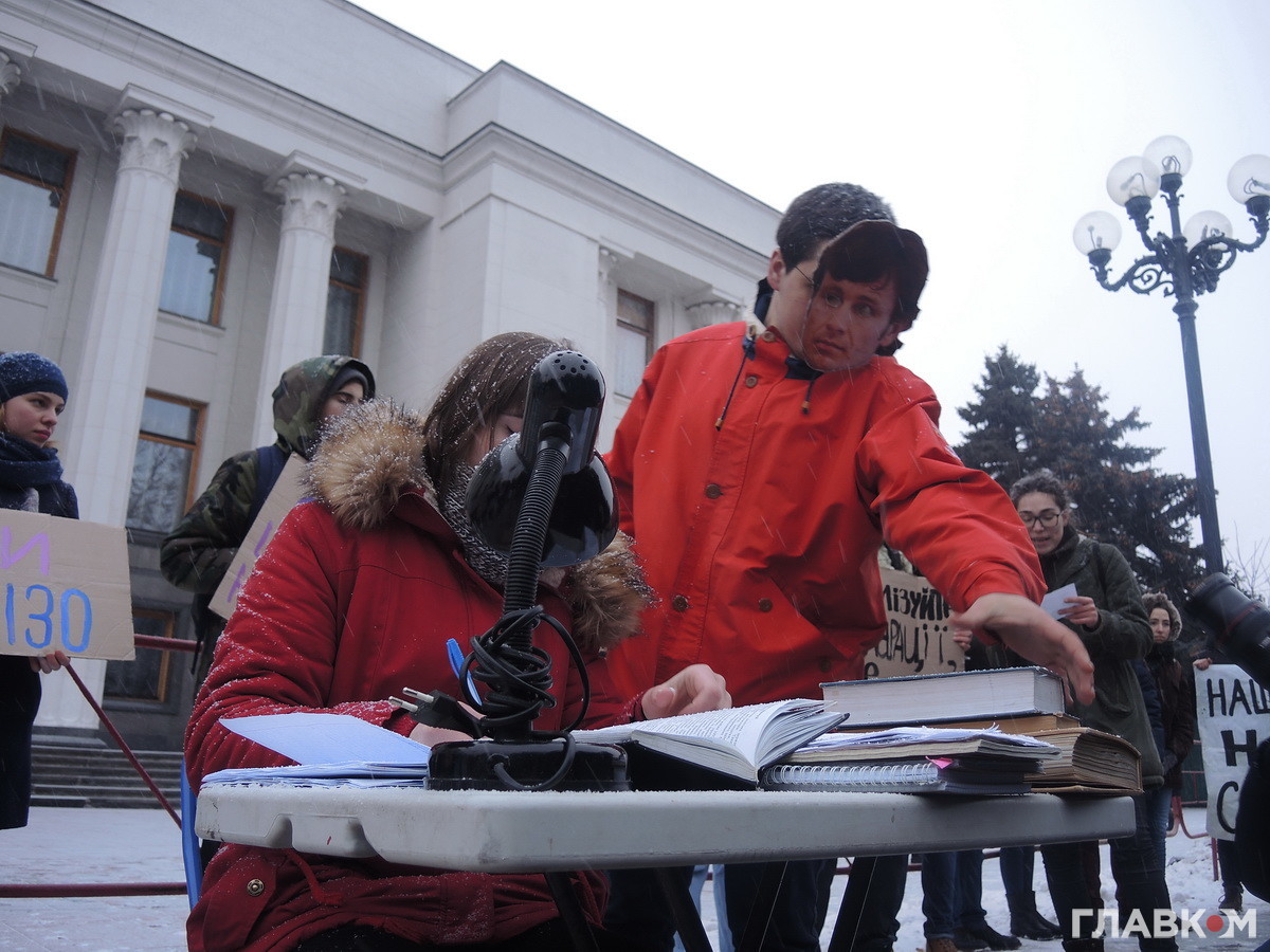 Також під ВР пройшло театралізоване дійство, під час якого активіст у масці заступника міністра фінансів Сергія Марченка викидав речі та книги студентки, мотивуючи це тим, що вони їм не потрібно.