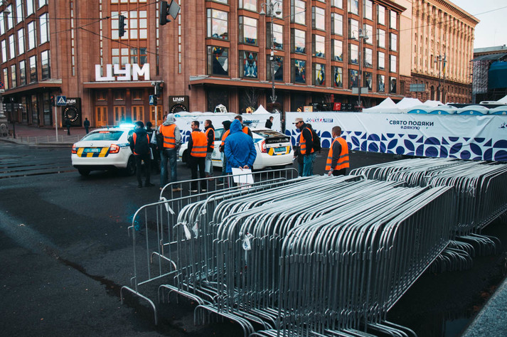 Робочі закінчували підготовчі роботи і прикрашали територію. А щоб проведенню Всеукраїнського дня подяки нічого не заважало, столичні копи перекрили Хрещатик для проїзду транспорту.