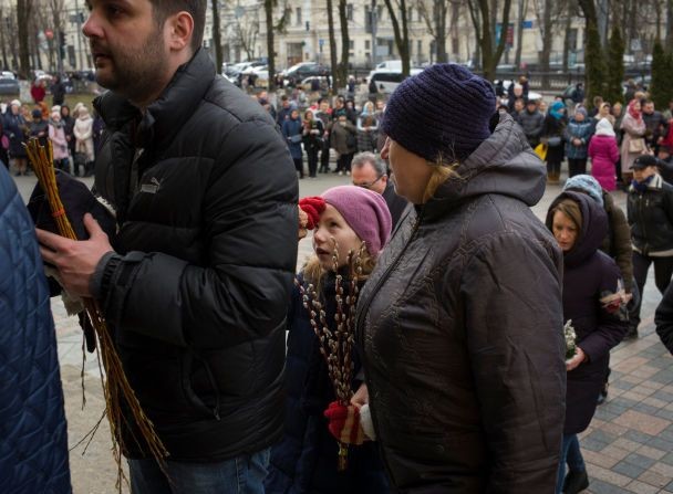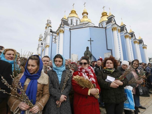 Віряни зібралися біля Михайлівського Золотоверхого монастиря, куди принесли гілочки верби. Вони символізують пальмове віття, яким вітали вхід Ісуса в Єрусалим напередодні його розп'яття.