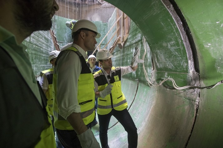 Віталій Кличко також спустився у колектор. Відповідаючи на запитання журналістів, що являє собою цей об’єкт і як він виглядає зсередини, мер зазначив, що це велика труба діаметром 3 м, яка будується з використанням сучасних технологій.