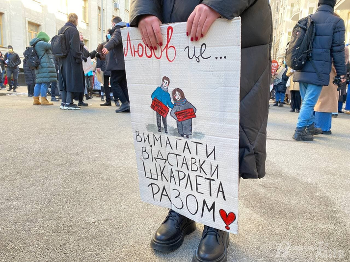 Учасники прийшли з сотнями банерів та транспарантами, на яких написали: «Шкарлет=корупція», «Чекаю, коли ти станеш колишнім, «Твоя відставка змушує серце битися частіше», «Love is…вчасно прощатися» тощо. Крім того, студенти принесли крижане серце з фотографією міністра, яке потім розбили.