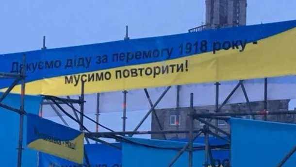 Водночас на Майдані є конструкції і з гаслами іншого роду – «Дякуємо діду за перемогу 1918 року – мусимо повторити!».