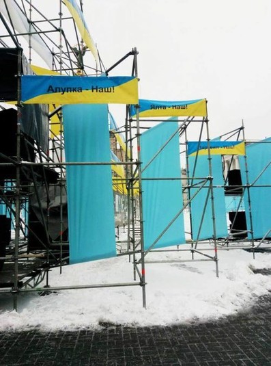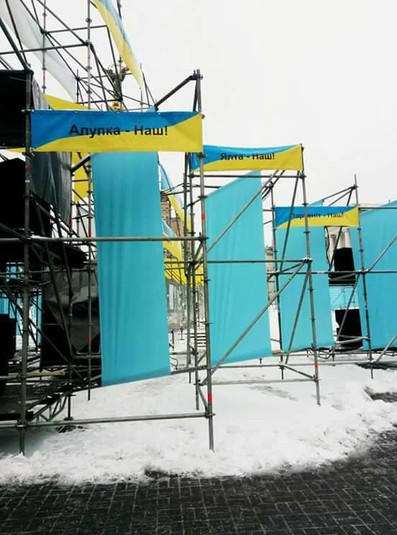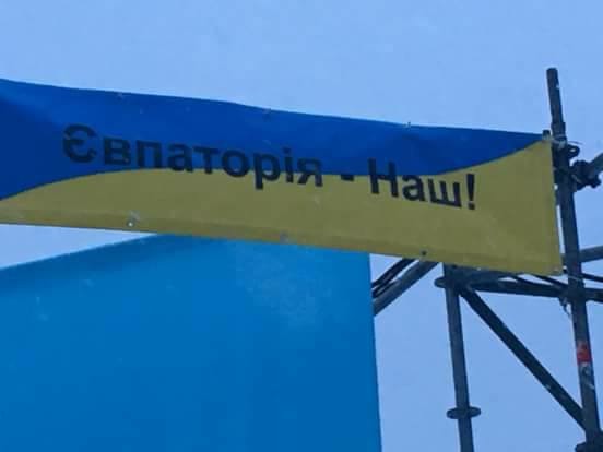«Алупка – наш. Ялта – наш. Євпаторія – наш». На Майдані Незалежності встановлені конструкції з шокуючими надписами. Виконавцем інсталяції виступив український театральний режисер Сергій Проскурня. Саме такою мовою, на думку митця, розмовляють киримли. Окрім лінвістичного уродства, Проскурня на замовлення заступника глави адміністрації президента України Віталія Ковальчука вивісив гасло у російському стилі «дякуємо діду за перемогу…», – зазначив ФБ-користувач, художник-карикатурист Георгій Ключник.