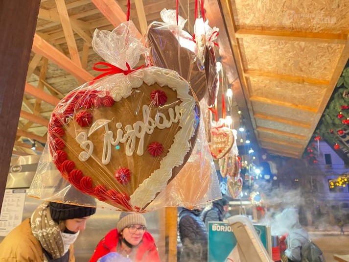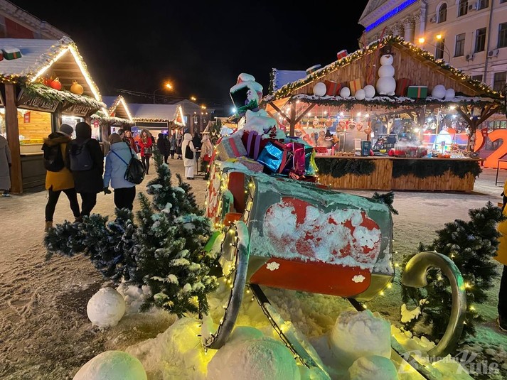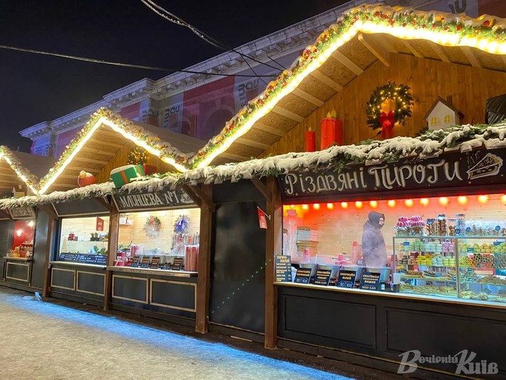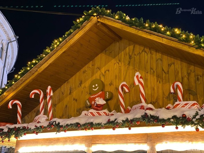 Дахи ярмаркових будинків прикрасили пряниковими чоловічками, хвойними гілочками, срібними шишками, свічками, різдвяними віночками та навіть подарунками.