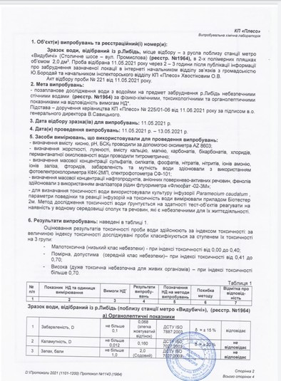 Комунальщики також уточнили, що проби води для аналізу брали поблизу станції метро «Видубичі» (Столичне шосе-вул. Промислова) 11 травня через 2-3 години після публікації інформації про забруднення, аналіз здійснювала лабораторія підприємства.