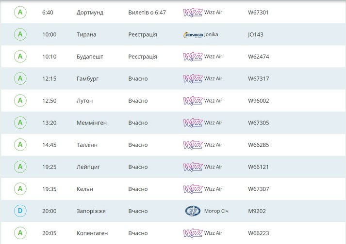 Окрім чартеру сьогодні в аеропорту «Київ» очікують на виліт рейсові літаки лоуткостера Wizz Air. Зранку вже вилетів борт у Дортмунд. Готуються до подорожі літаки у Будапешт, Гамбург, Лутон. Меммінген, Таллін, Лейпциг, Кельн, Коппенгаген.