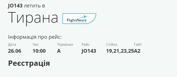 О 10 ранку вилетить літак до Албанії. Наразі вже триває реєстрація на рейс. Переліт здійснює авіакомпанія Jonika.