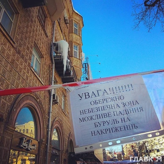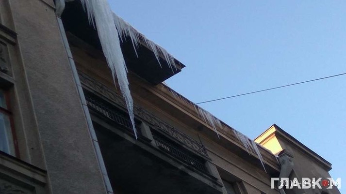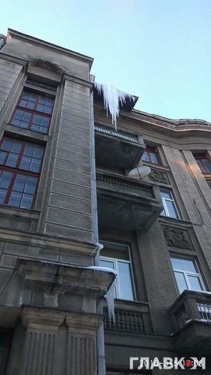 Як інформував «Главком», після великих снігопадів у Київ прийшла відлига, сніг на дахах будинків тане, перетворюючись під час коливань температури на великі бурульки і льодові брили.