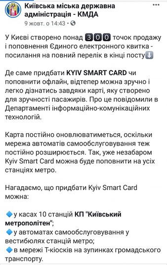 Столична влада повідомила, що у Києві створено понад 300 точок продажу і поповнення єдиного електронного квитка – як на зупинках громадського транспорту, так і на 17 станціях столичного метрополітену.